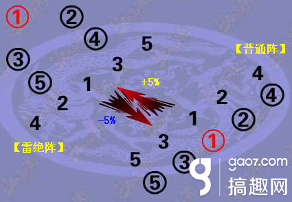 雷绝阵VS普通阵:被克制5% 己方受伤害+5% 对方受伤害-5%
