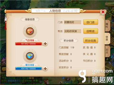 第一步:点击右上角人物头像选择信息或随便点击一个师门任务回师门