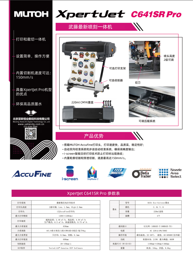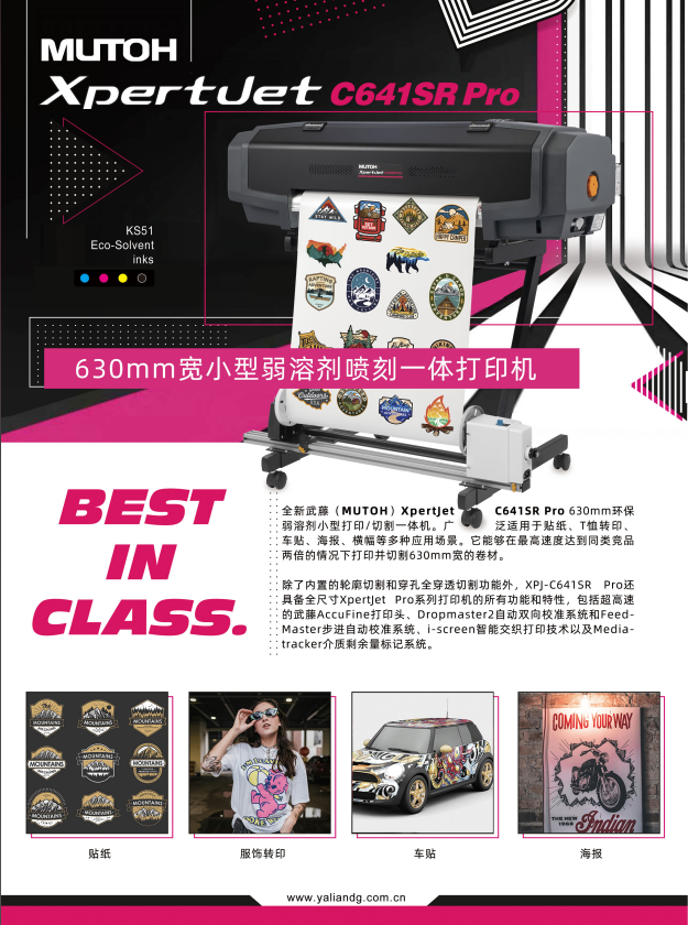 XpertJet C641SR Pro在日本设计和组装,是一款紧凑桌面级的打印机/切割机,它的应用是标识标志,全彩贴纸,车辆拉花贴纸,横幅,海报,标签,服饰热转印(亲子服装、帽子、鞋、T恤、团建服装定制等)和艺术品复制。