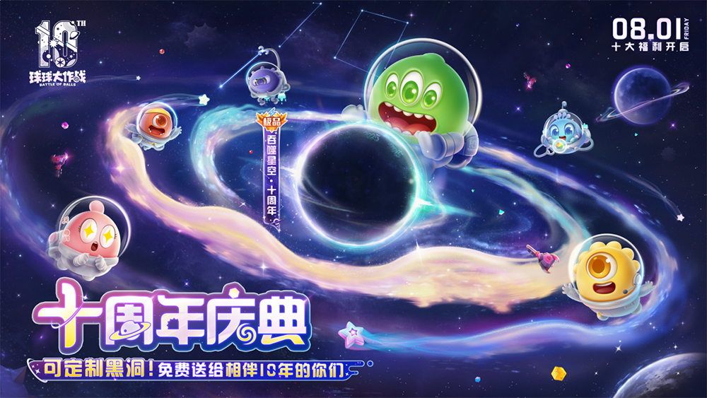 相伴十年,星光同行!8月1日,国民手游《球球大作战》迎来十周年福利庆典,十大福利放送,全员登录即送限定黑洞光环,上线无门槛领100把超大钥匙,连续7周登录即送绝版自选皮肤,更有十周年皮肤套装、纪念头像框、瓜分10亿金蘑菇等海量福利送给全体球宝;球球怀旧服也将同步开启,一键穿越,还原最纯粹的体验。